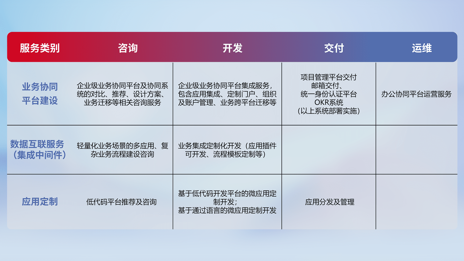 针对钉钉、、、企微、、IDaas等平台级产品提供产品的规划、、方案、、、、交付、、、定制化开发等服务,,,,实现如统一协同办公、、、、智能客户服务、、混合会议管理、、、、智能数据查询、、、等业务场景,,,实现数字化转型。。。。