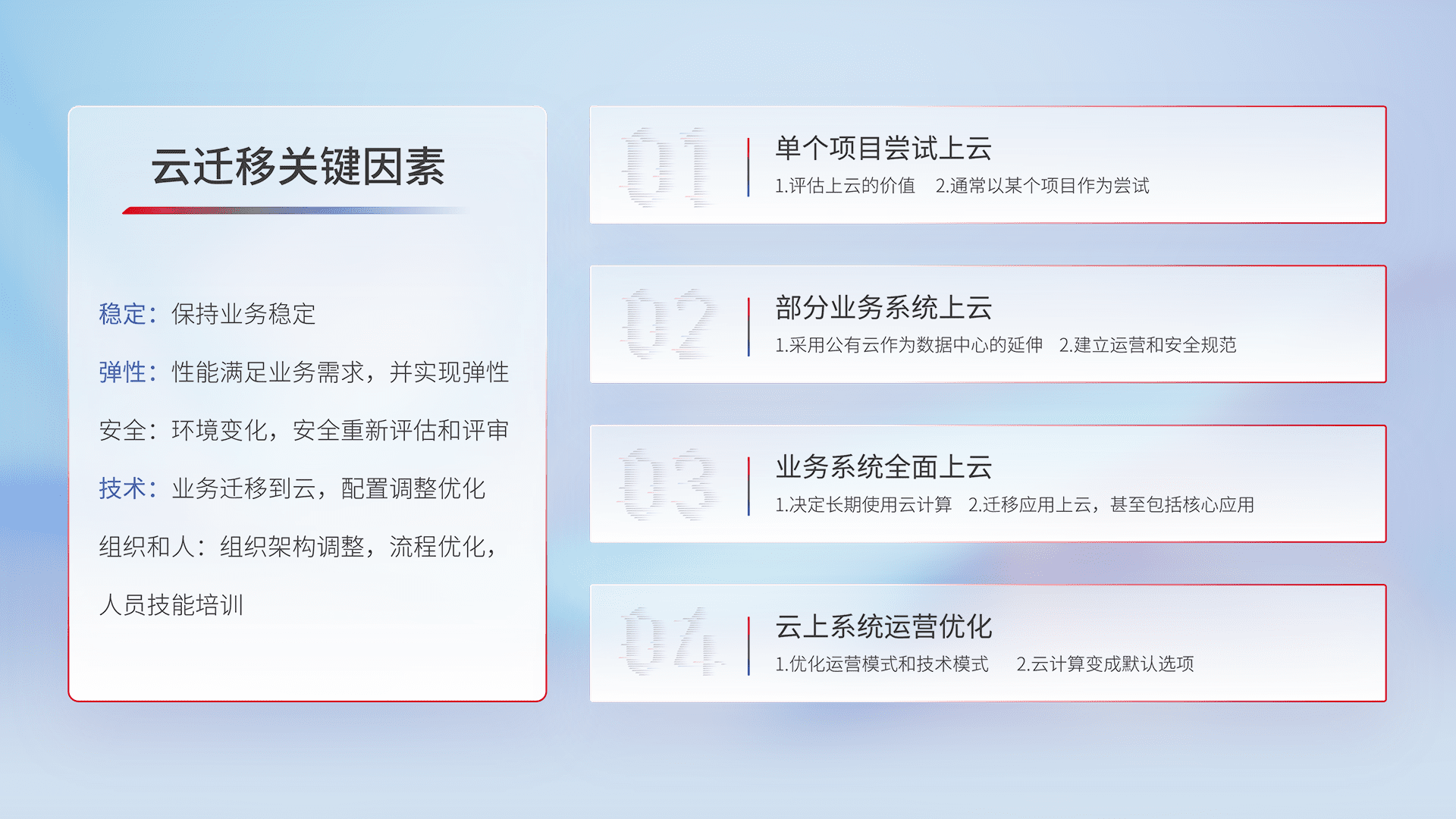 结合实际业务,,从规划设计、、、云平台选型、、、、云原生改造、、数据迁移、、集成交付,,迁移全过程为客户识别最佳上云路径,,,,做好风险识别管理,,,,设计网络架构、、、身份权限、、、、安全审计合规、、、、操作审计、、、日志审计、、、、监控告警策略、、、多站点容灾设计等,,,,对云上基础设施进行整体规划,,,提升IT治理水平,,以满足弹性、、高可用、、高性能的需求。。。