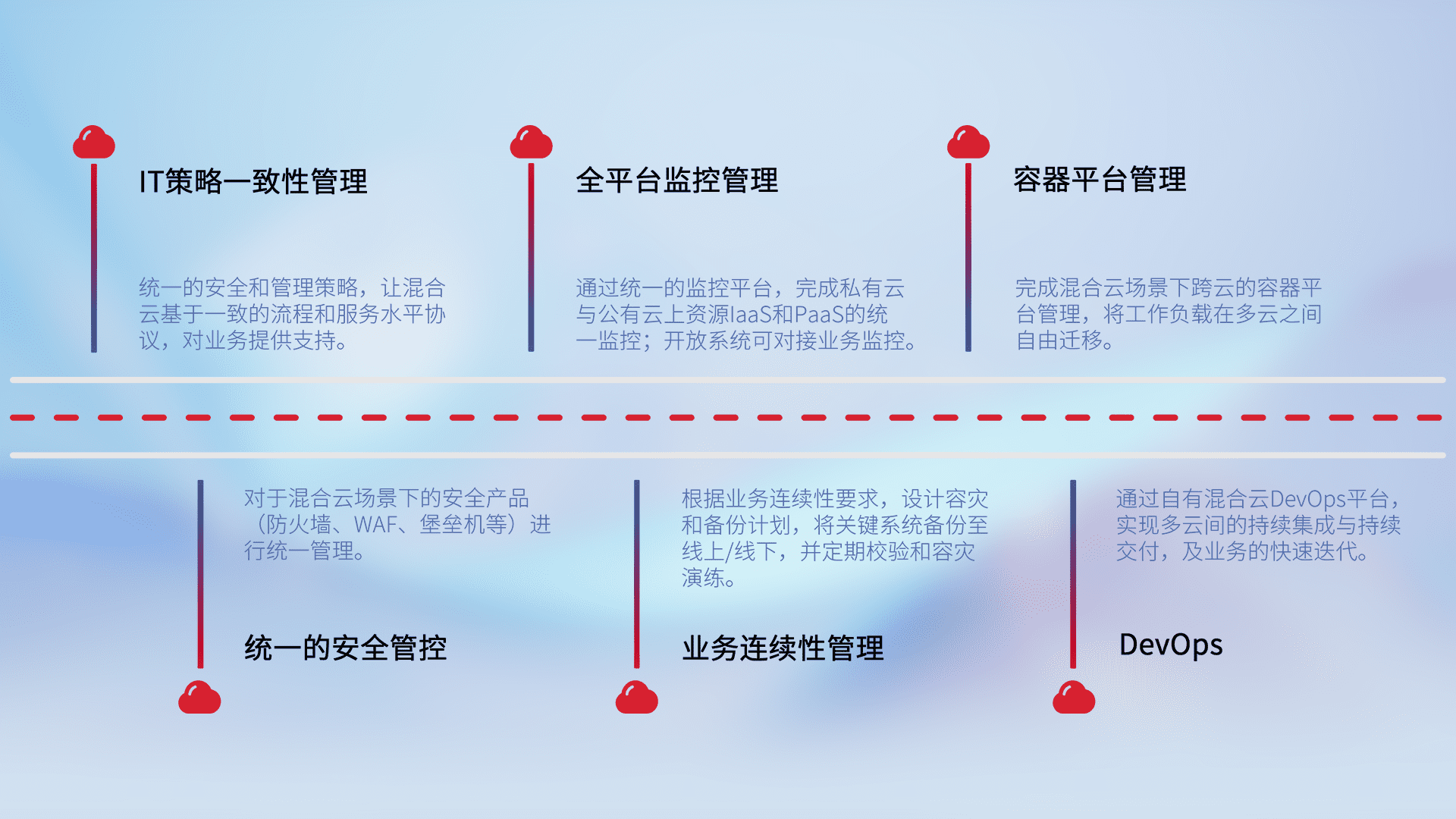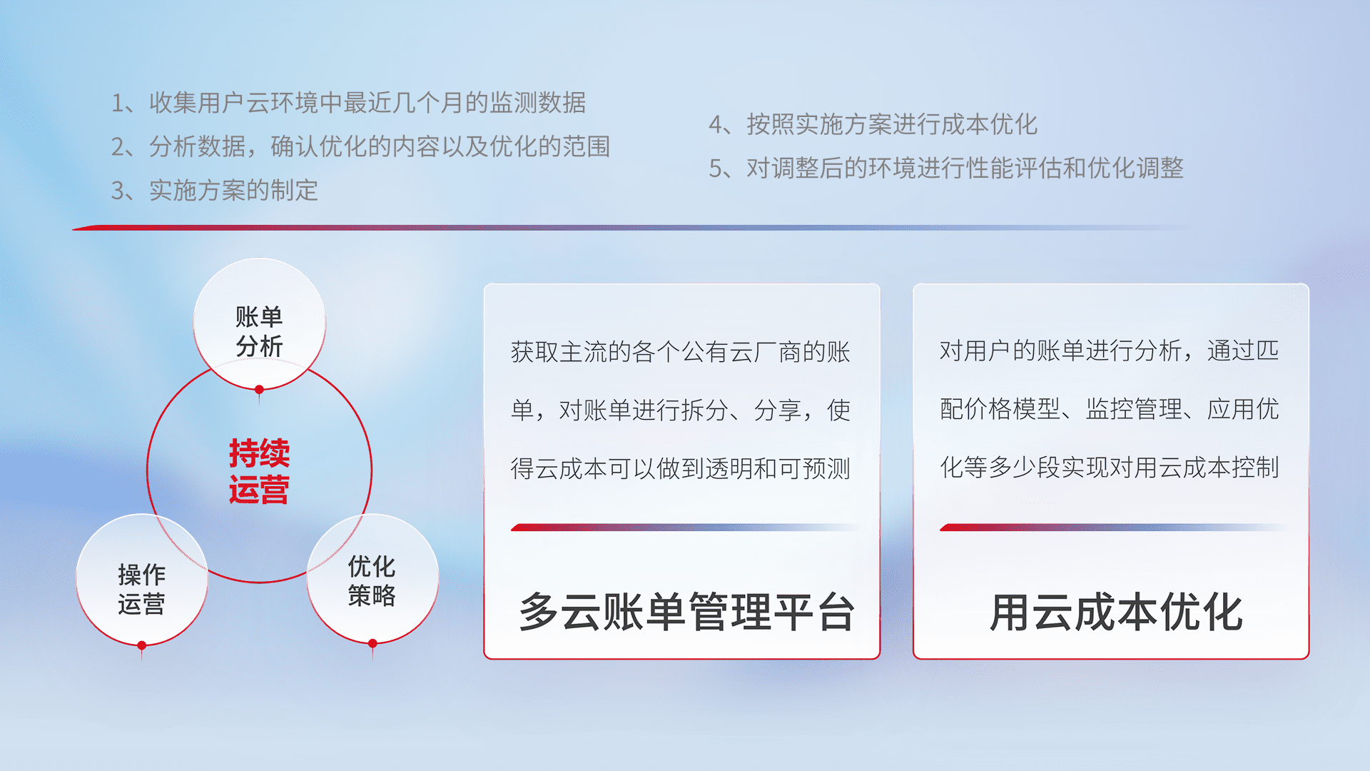 通过多云纳管,,以统一的资源数据模型把客户的云资源进行抽象和封装,,,,进而实现对多云资源的统一操作,,,,保障云资源管理的可靠性、、、、稳定性与可用性。。。量身定制化运维内容,,,,配置、、开发运维、、、补丁管理、、、备份、、、监控、、认证和访问管理、、、审计和日常巡检等,,保障在用云过程中的可靠度,,,,稳定度以及高可用率。。。。